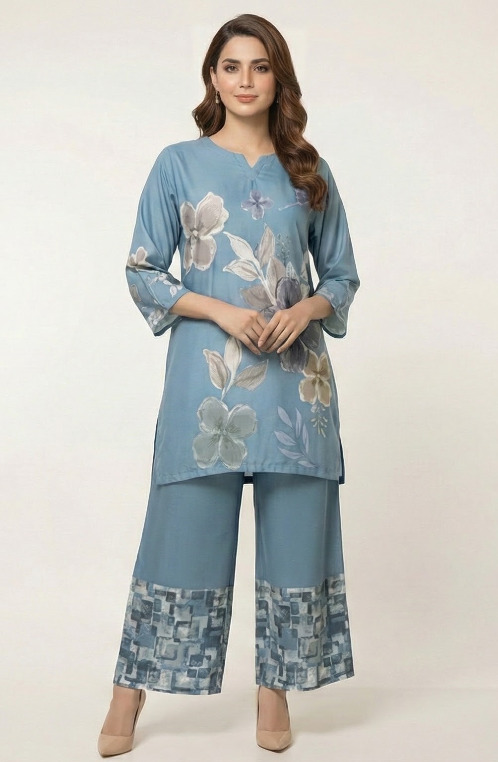 A premium stitched 2-piece printed co-ord set inspired by Pakistani designer fashion. Elegant floral design, breathable fabric, and ready-to-wear comfort—perfect for UAE women seeking stylish everyday outfits.