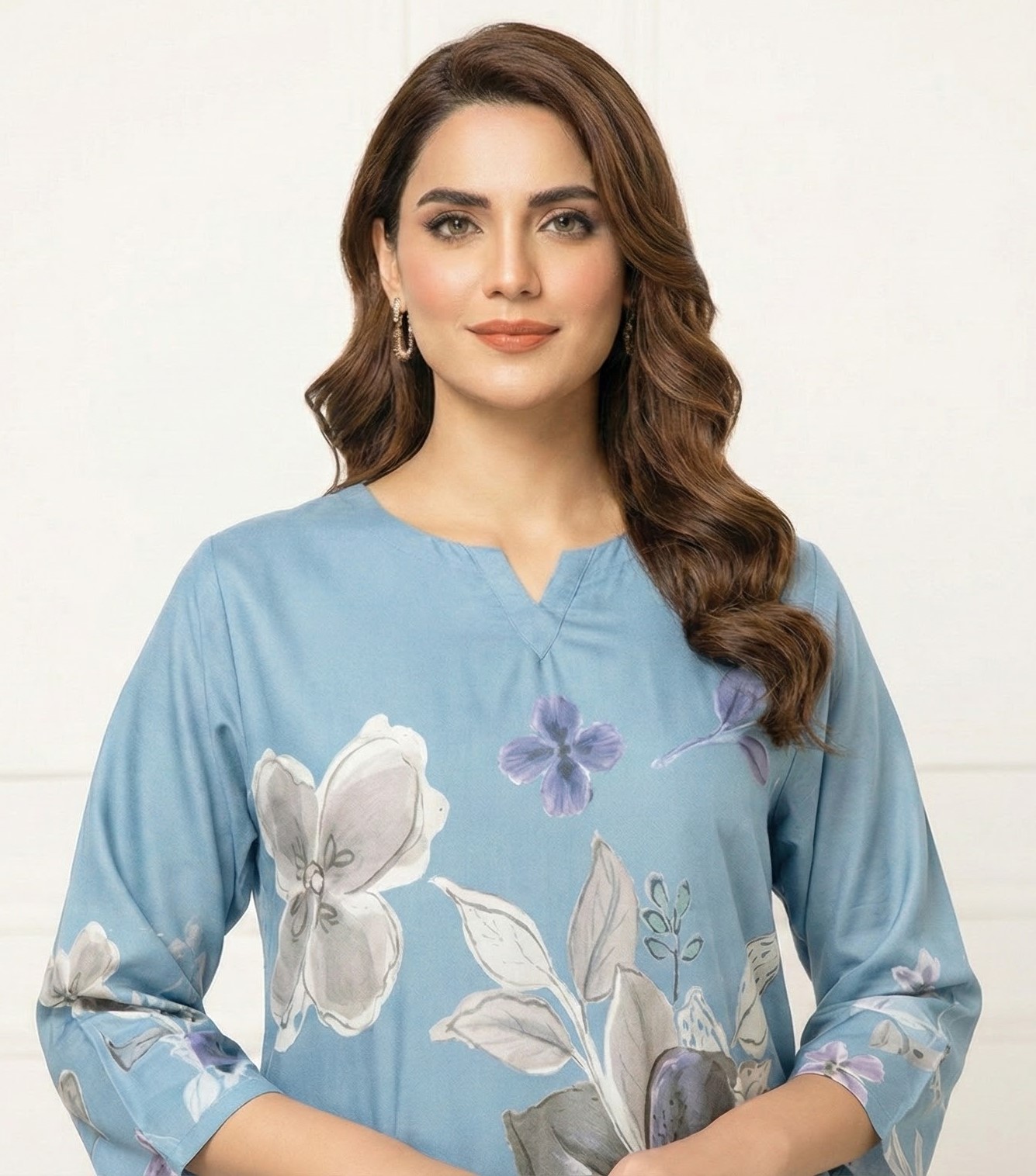 Made from soft, breathable fabric with a luxurious fall, this ready-to-wear stitched suit offers the perfect blend of comfort, sophistication, and modern floral charm. The beautifully illustrated floral motifs in cool tones make this outfit a timeless wardrobe essential for women who love effortless style.