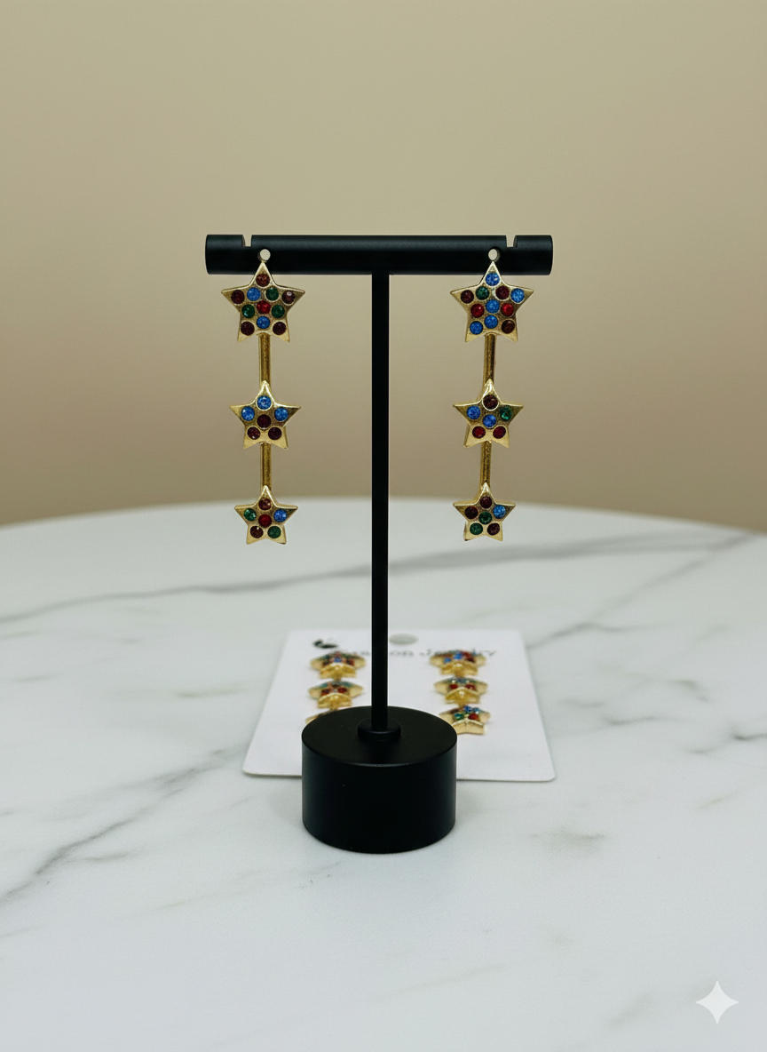 Featuring three-tier star designs with multicolor CZ crystals, these earrings combine elegance and playfulness — perfect for both casual and party wear.